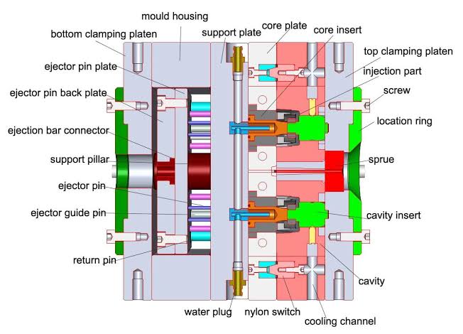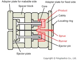 Injection molds come in all sorts of structures, from 2-plater to hot runner molds depending on application and design requirements, but most typically consist of these elements: